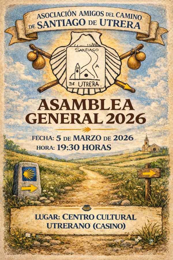 La Asociación Amigos del Camino de Santiago de Utrera, celebrará Dm ASAMBLEA General de Socios 2006, correspondiente al ejercicio 2025 el jueves 5 de marzo a las 19:30 horas en el Centro Cultural Utrerano (Casino).