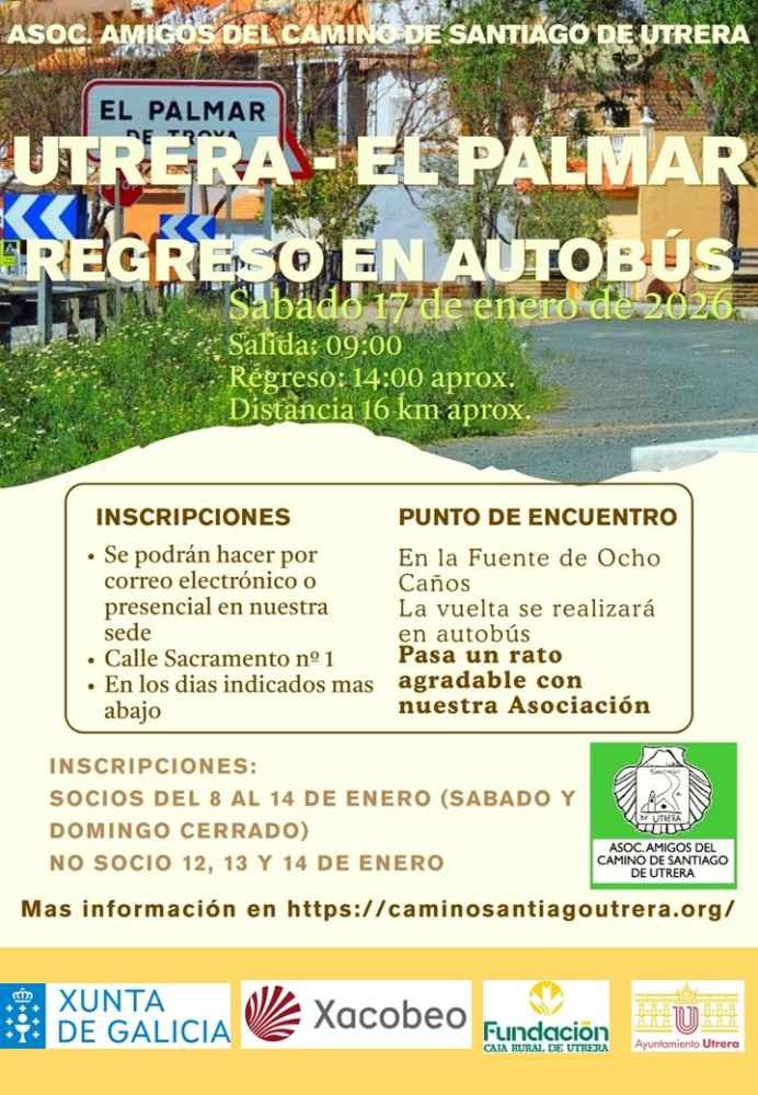 El próximo 17 de enero de 2026, la Asociación Amigos del Camino de Santiago de Utrera organiza su cuarta ruta por los alrededores de nuestra localidad, con el objetivo de dar a conocer la riqueza y variedad de caminos y parajes que se pueden disfrutar dentro de nuestro término municipal.